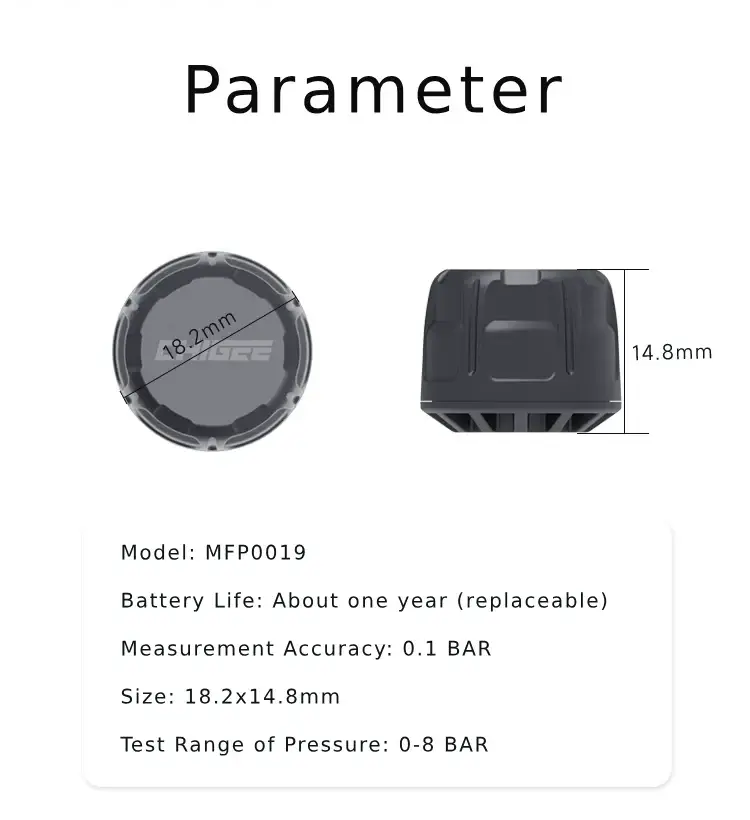 Chigee harici lastik basınç sensörünün kurulumu kolaydır ve yüksek kaliteli alüminyum alaşımdan yapılmıştır. Kompakt bir boyuta ve uzun ömürlü bir pile sahiptir. Gerçek zamanlı lastik izleme, lastik basıncı ve sıcaklığı ile ilgili eşzamanlı verileri görüntüleyerek lastik güvenliğine sürekli odaklanılmasını sağlar.
