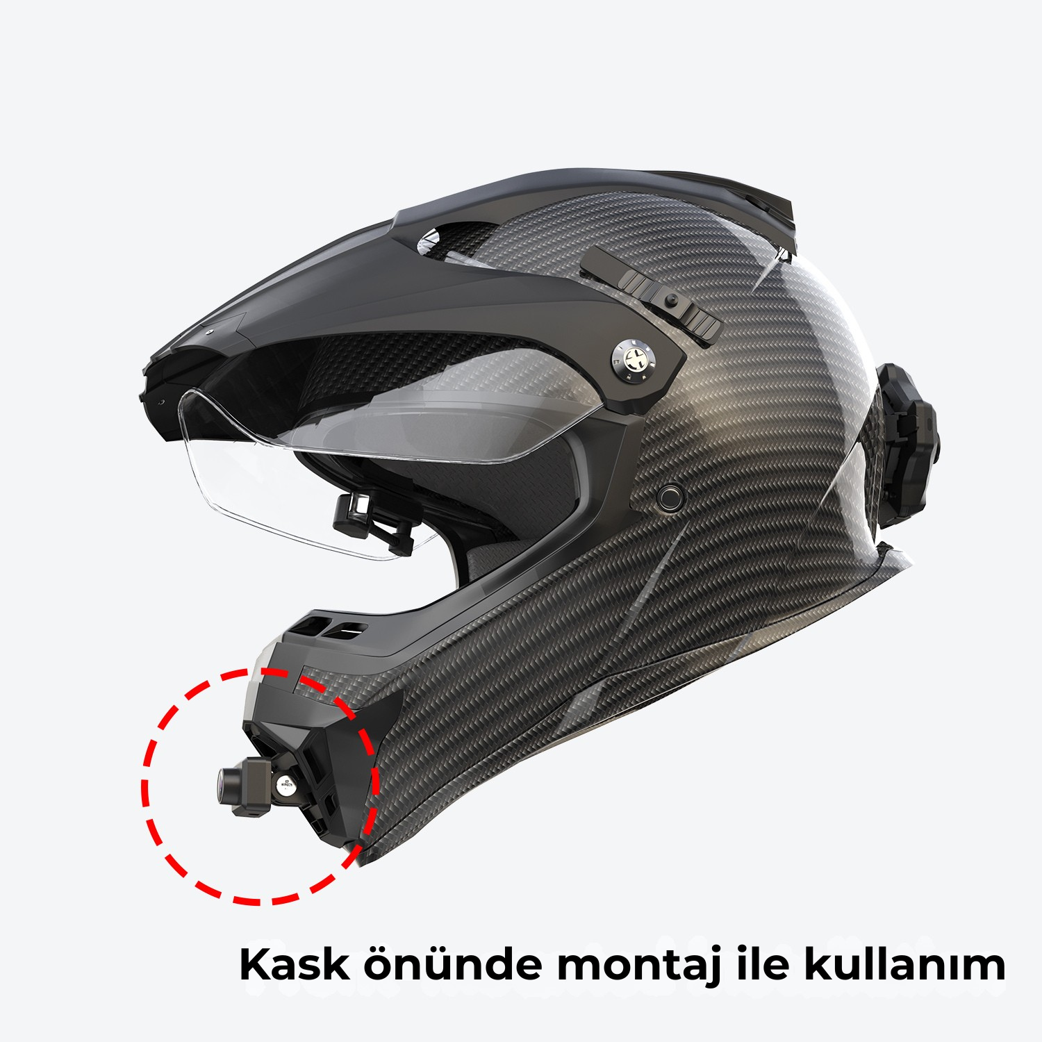 Ön kamera modülü, MotoEye E6+ ile birlikte kullanılmak üzere tasarlanmıştır.Her türlü kaskın çene veya yan kısmına kolayca monte edilebilir ve sürüşlerinizi birinci şahıs (first-person) açısıyla yüksek çözünürlükte kaydetmenizi sağlar.